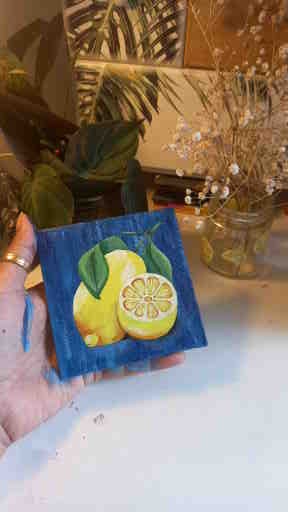 Bring a burst of freshness and sunshine into your space with “Citrus Glow,” a delightful mini acrylic painting featuring bright, hand-painted lemons resting against a deep blue background. The vivid contrast of yellow and navy captures the essence of summer — vibrant, refreshing, and full of life.