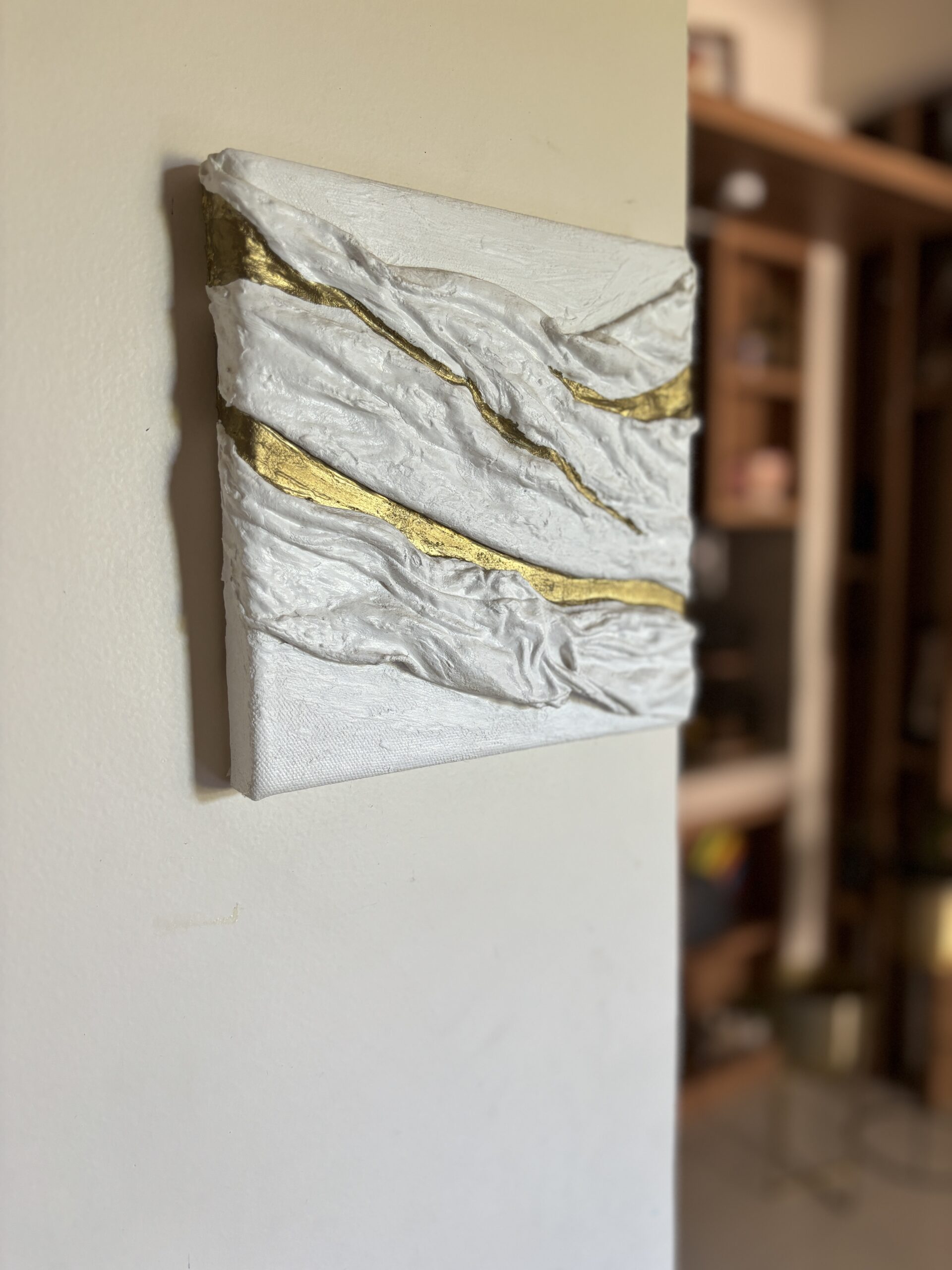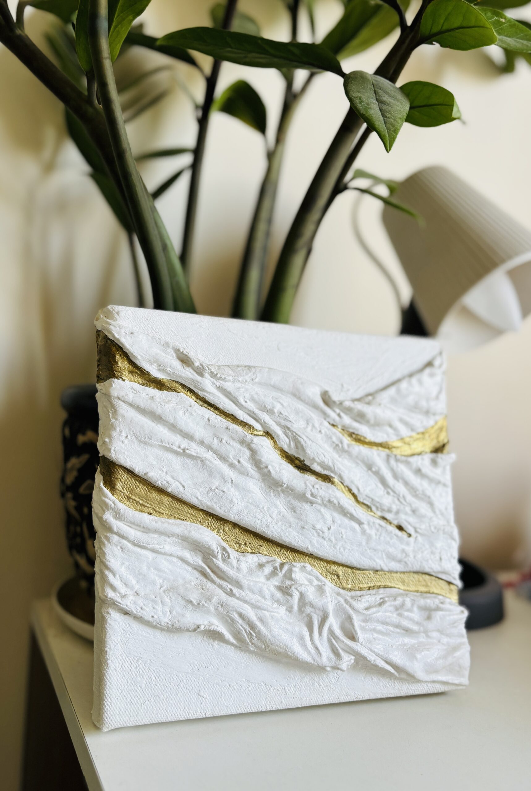 Exuding calm sophistication, “Ethereal Drift” is a stunning hand-textured abstract artwork that blends simplicity with opulence. The canvas features flowing sculptural textures in pure white, delicately accentuated by streaks of luminous gold — evoking the gentle movement of fabric or drifting clouds.