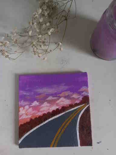 Embrace the quiet beauty of twilight with “Road to Dusk,” a serene mini landscape painting that captures the feeling of an endless evening drive. The artwork features a winding road leading toward a glowing horizon, bathed in shades of lavender, rose, and sunset orange, evoking freedom, reflection, and calm wanderlust.