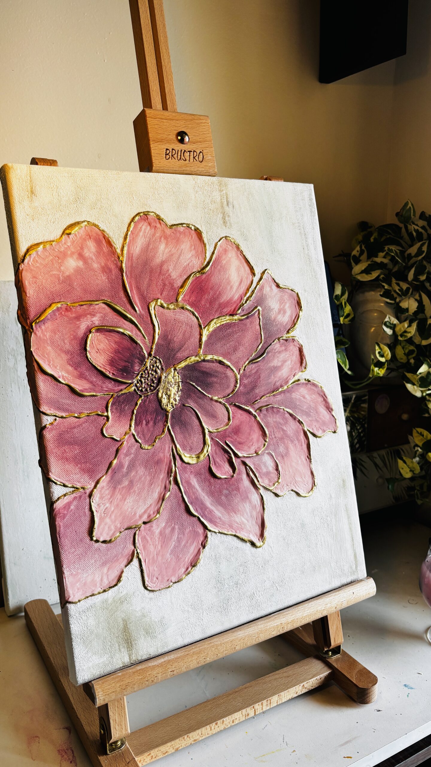 “Blush Bloom” celebrates the quiet elegance of nature through texture, color, and light. This original acrylic painting features a single large flower in delicate shades of rose and mauve, outlined with subtle golden accents that catch the light beautifully. The petals rise gently from the canvas, adding depth and dimension — creating a tactile, sculptural effect that invites both visual and physical connection.