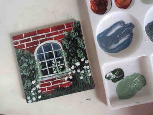 Hand-painted with intricate brushwork, this piece brings together earthy brick tones, lush greens, and subtle sky blues to create a rustic yet elegant aesthetic. Perfect for desks, bookshelves, or small wall displays, it evokes the coziness of countryside cottages and garden serenity.